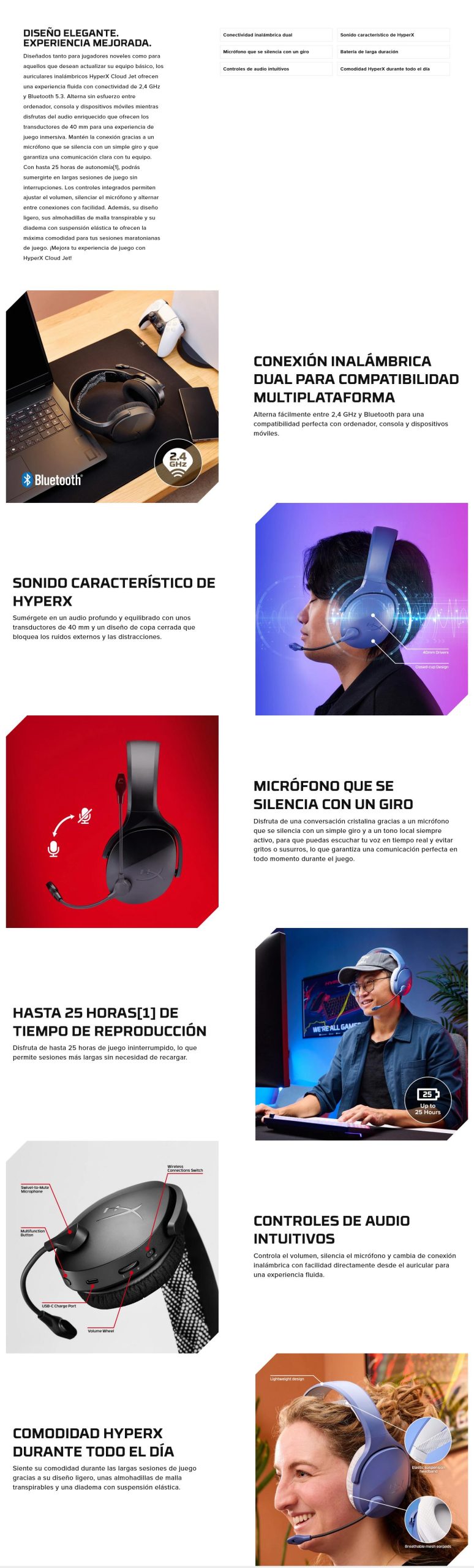 Los HyperX Cloud Jet son audífonos inalámbricos diseñados para jugadores que buscan una experiencia de audio versátil y cómoda. Con conectividad dual mediante tecnología inalámbrica 2.4 GHz y Bluetooth 5.3, permiten cambiar fácilmente entre PC, consolas y dispositivos móviles. Equipados con controladores de 40 mm, ofrecen un sonido claro y envolvente ideal para sesiones de juego prolongadas. Su micrófono montado, con brazo giratorio y función de silencio, facilita una comunicación efectiva durante el juego. Además, su diseño ligero y almohadillas transpirables aseguran comodidad durante largas horas de uso.